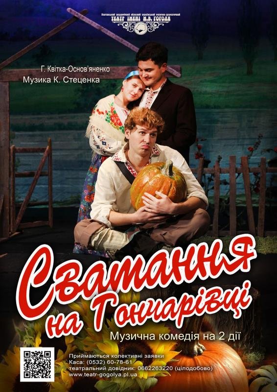 «Сватання на Гончарівці» - музична комедія Григорія Квітки-Основ’яненка та композитора Кирила Стеценка, що належить до скарбниці української класичної драматургії ХІХ століття. Сценічна історія цього твору у Полтавському театрі розпочалася ще у 40-х роках минулого століття, і остання постановка датована 1967 роком.