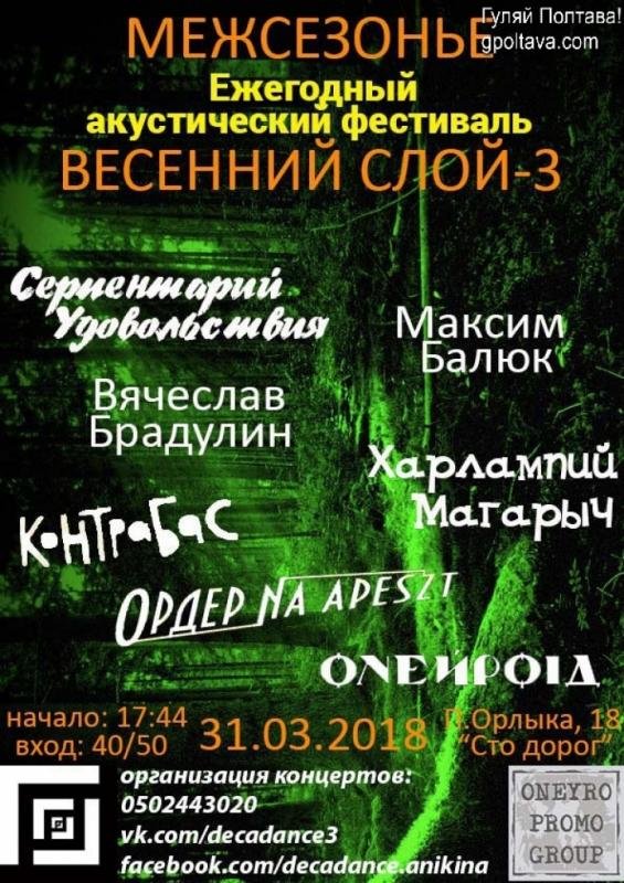 Друзья, приглашаем вас всех на традиционный уже третий акустический фестиваль "Весенний Слой". Как и всегда, в этом году мероприятие обещает превратиться в настоящий праздник для любителей душевной атмосферы акустических концертов и авторской песни. По замыслу организаторов этот фестиваль в 2018 году перевоплощается в фестиваль "Межсезонье" и будет состоять из двух частей "Весенний Слой" и "Осенний Слой"(который запланирован на осень 2018), под лозунгом, что праздников много не бывает. Но это все в планах, а на "Весеннем Слое" в этом году ожидаются выступления просто невероятных исполнителей:
