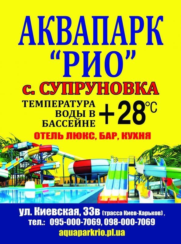 Аквапарк «РИО» в Супруновке Полтавской области приглашает детей и взрослых разделить радость водных развлечений, аттракционов и отличного настроения. Аквапарк в Полтаве открылся в июле 2017 года. Здесь применено новое оборудование, передовые технологии очистки воды, система подогрева воды, надежные конструкции.