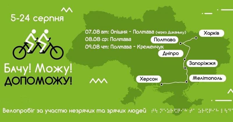 Зустріньте учасників веломандрівки на в’їзді у Полтаву – 7-го серпня о 19:00. Прес-конференція організаторів велопробігу у Полтаві відбудеться 8-го серпня об 11:00 в ОКІА "Новини Полтавщини", вул. Соборності, 45. Познайомитися з учасниками велопробігу та спробувати кермувати тандемом, або із закритими очима на другому місці, відчути світ навколо по-іншому у Полтаві можна буде 8-го серпня з 14:00 до 16:00 на Театральній площі (вул. Гоголя 17). Понад 1000 км на велосипедах-тандемах – в Україні відбудеться унікальний велопробіг за участі незрячих та зрячих людей З 5 по 24 серпня 2018 року учасники велопробігу «Бачу! Можу! Допоможу!» проїдуть понад 20 міст: з Харкова через Полтаву, Дніпро, Запоріжжя до Херсону. Організатори закликають долучатися усіх бажаючих: можна стати пілотом, штурманом або волонтером проекту. Велопробіг «Бачу! Можу! Допоможу!» – перша в Україні соціальна ініціатива, завдяки якій незрячі люди можуть повноцінно подорожувати країною на велосипедах, а також соціалізуватись – адже весь маршрут вони долають разом зі своїми зрячими напарниками. Долучитися до велопробігу може кожний: на власному велосипеді; стати пілотом тандему; штурманом, якщо ви маєте порушення зору; волонтером для допомоги під час мандрівки. Доєднатися до пробігу можна на будь-яку дистанцію та будь-яку кількість днів. Для цього потрібно заповнити анкету на сторінці велопробігу в фейсбуці: https://www.facebook.com/iseeua. “Ми робимо велопробіг вже четвертий рік поспіль і за цей час кількість учасників збільшилася втричі, - говорить координаторка велопробігу Вікторія Лучка. Цього року велопробіг відбувається в пам’ять українця Миколи Пеха. Незрячий від нарождення Пех зумів досягти надзвичайних успіхів у самореалізації - отримав освіту у сфері міжнародних відносин як в Україні, так і в США, Канаді та Великобританії, працював та викладав, а також створював можливості для самореалізації як зрячих так і незрячих молодих людей по всій Україні”. Велопробіг розпочнеться 5-го серпня із площі Свободи у Харкові. За увесь час його учасники подалають понад 1000 кілометрів і ще раз доведуть – великі зміни у світі починаються з маленьких подорожей. 24-го серпня на фініші у Херсоні “Бачу! Можу! Допоможу!” встановить рекорд України як найбільший велопробіг за участі незрячих і зрячих людей на тандемах. Facebook-сторінка велопробігу: https://www.facebook.com/iseeua. Сайт: velo-tandem.org Організатори: ГО «Інститут українських студій», ГО людей з інвалідністю Fight For Right. Співорганізатори в Полтаві: ГО «ВелоПолтава». За підтримки Посольства США в Україні.