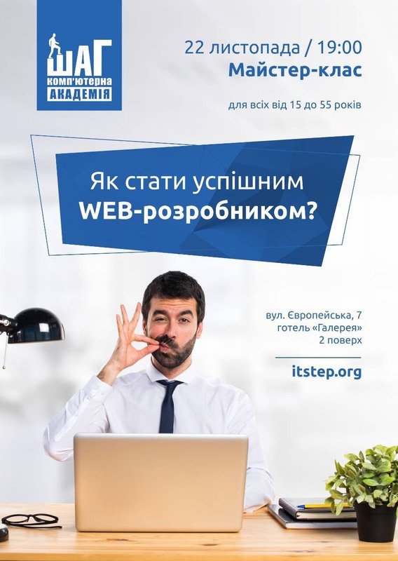 Тоді обов'язково завітайте 22-го листопада о 19:00 на безкоштовний майстер-клас "Як стати успішним WEB-розробником"