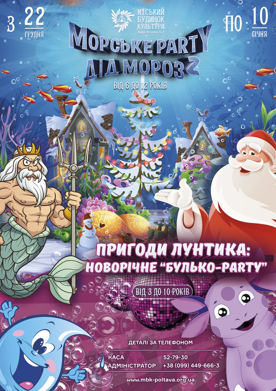 Наш ПМБКашний Дід Мороз де тільки не бував…! Що тільки не робив …! В космос на зорельоті мандрував, короля від лінощів рятував, по дахах з Карлсоном літав, на дикому заході новий рік зустрічав! А ось у підводному царстві ще не бував! Запрошуємо і вас разом з ним відсвяткувати новий рік під водою: запальні ігри, нові прикольні друзі, захоплюючі мандри та безкінечні веселощі разом з Дідом Морозом, який запрошує всіх на «Морське Party».