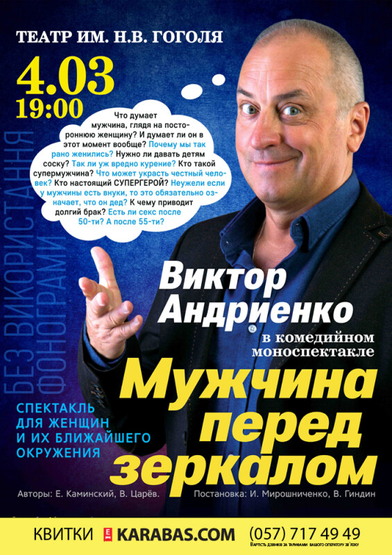 “Мужчина перед зеркалом” — это спектакль для женщин и… их ближайшего окружения. “Мужчина перед зеркалом” — это комедия с элементами ностальгии и… претензией на знание жизни. “Мужчина перед зеркалом” — это ироничный монолог от имени поколения, выросшего в эпоху красных пионерских галстуков и черно-белых отечественных телевизоров. “Мужчина перед зеркалом” — это откровенные признания только для взрослых, вернее, для бывших детей. Главный герой в исполнении Виктора Андриенко даёт, наконец, ответы на “вечные” вопросы: Что думает мужчина, глядя на постороннюю женщину? И думает ли он в этот момент вообще? Почему мы так рано женились? Нужно ли давать детям соску? Чего бояться на встрече одноклассников? Так ли уж вредно курение? Кто такой супермужчина? Что может украсть честный человек? Кто из СУПЕРГЕРОЕВ родился в СССР? Куда делись автоматы с газводой? Неужели если у мужчины есть внуки, то это обязательно означает, что он дед? К чему приводит долгий брак? Есть ли секс после 50-ти? А после 55-ти? Другими словами, всё,