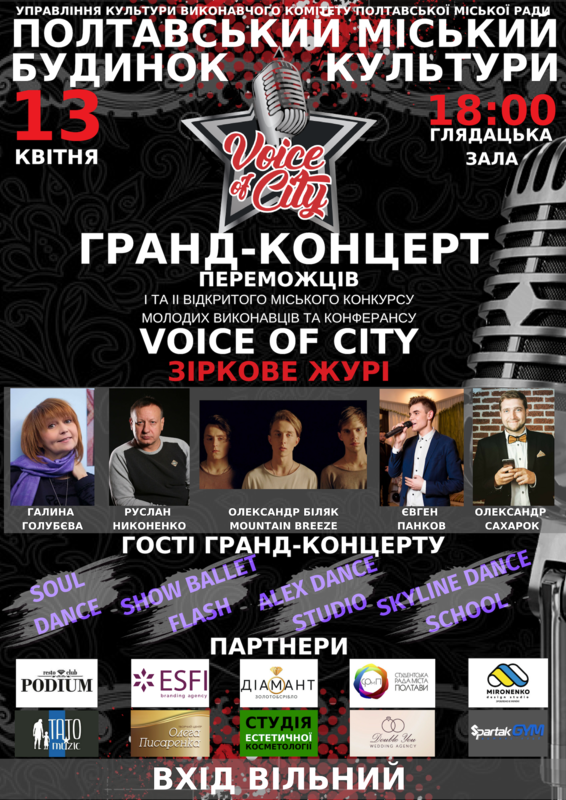 13 квітня о 10 годині Полтавський міський Будинок культури проводить другий етап ІІ відкритого міського конкурсу вокалістів та ведучих "VOICE OF CITY".