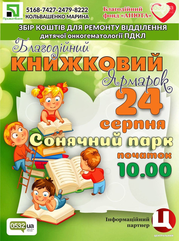 Книжковий ярмарок розпочнеться у Сонячному парку Полтави 24-го серпня о 10:00. Організовує захід благодійний фонд "Анюта". А зібрані від продажу книжок кошти організатори планують передати на ремонт відділення онкогематології дитячої клінічної лікарні. Про це повідомляють на сторінці благодійного фонду у «Фейсбук».