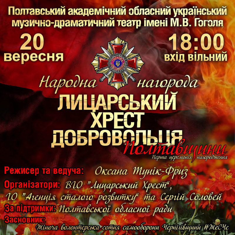 На заході буде вшановано 20 добровольців Полтавщини, 5 з якихвшановуються посмертно. Захід організовується ВГО «Лицарський Хрест»спільно з ГО «Агенція сталого розвитку» та Сергієм Солов’єм. Також організаціїзаходу сприє Полтавська обласна рада.