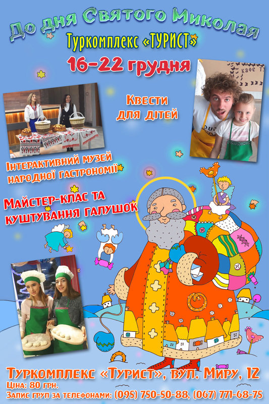 До дня Сятого Миколая (з 16 по 22 грудня) в туркомплексі Турист підготували дитячі квести! У нас Ви відчуєте справжнісінький святковий екшен. Ліпимо ритуальну страву – вареники (які потім і покуштуємо)! З сюрпризом, звісно ж, адже саме час для ворожіння… Відвідуємо Інтерактивний музей народної гастрономії, де трішки пограємо, поспіваємо, в майбутнє позаглядаємо…. Дуже зручно, не виходячи з готелю, потрапити в часи минулого та позаминулого століть. Тут і селянський інтер’єр, інтер’єр міщанина та дворянина ХІХ століття, речі побуту та кухонного ужитку.