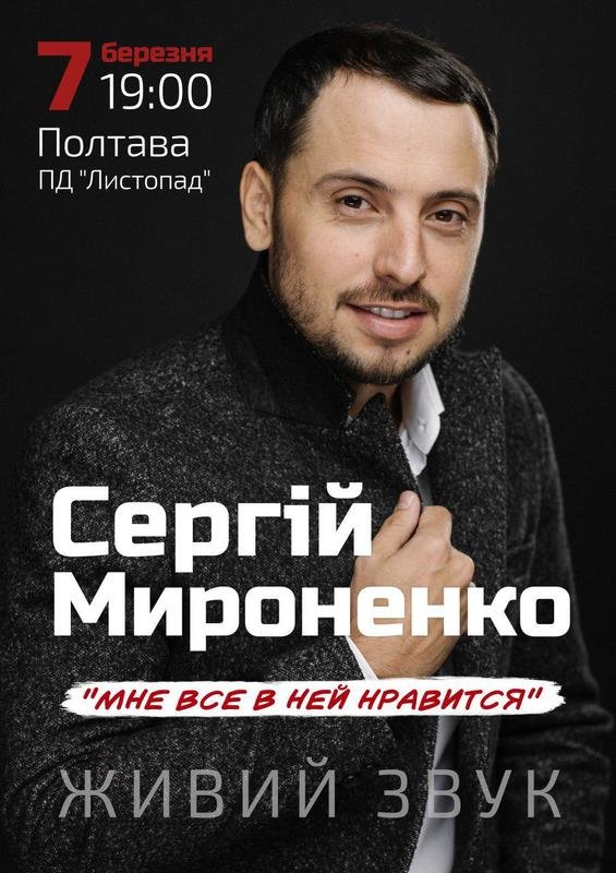 Український популярний співак у стилі «поп-шансон» Сергій Мироненко, що вже полюбився аудиторії, завдяки хітам «Мне все в ней нравится» та «Одинокий гордый», відправляється у перший всеукраїнський тур, який розпочнеться 7 березня у рідному краю співака - на Полтавщині. Двохгодинна концертна програма включатиме як вже відомі пісні, так і абсолютно нові ліричні композиції.