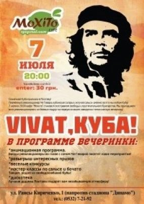 7 июля в 20:00 кафе «Moxito» становится островком свободы и притягательного бунтарства. Мы приглашаем всех революционеров и их боевых подруг на первую в нашем заведении тематическую вечеринку «Vivat, Куба!».