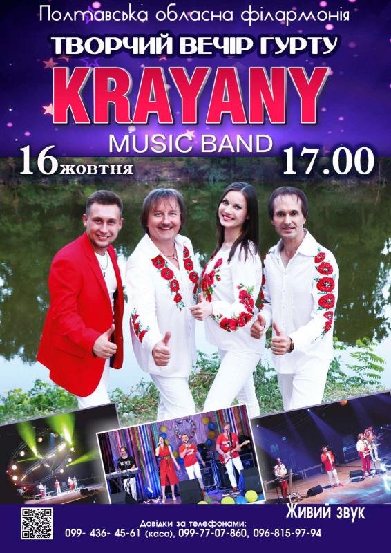 Шановні глядачі! Полтавська обласна філармонія запрошує Вас на концерт легендарного гурту «Краяни». Цей колектив відомий не тільки в Україні, а і за її межами. В репертуарі пісні, які знає і співає вся Україна. Популярність хітів гурту «Краяни» тримається роками та надихає творити і любити своє, українське. Цього вечора музиканти подарують Вам настрій кохання, єдності та перемоги.
