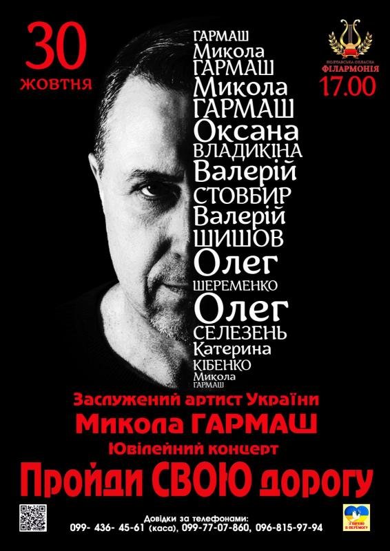 30 жовтня відбудеться ювілейний концерт заслуженого артиста України Миколи Гармаша. Прихильники матимуть змогу насолодитися як знайомими, так і новими піснями у виконанні артиста. Також у концерті візьмуть участь відомі у Полтаві музиканти Олег Селезень, Валерій Шишов, заслужений артист України Валерій Стовбир та Оксана Владикіна й легендарний музикант Олег Шеременко. Ведуча цього вечора чарівна Катерина Кібенко.