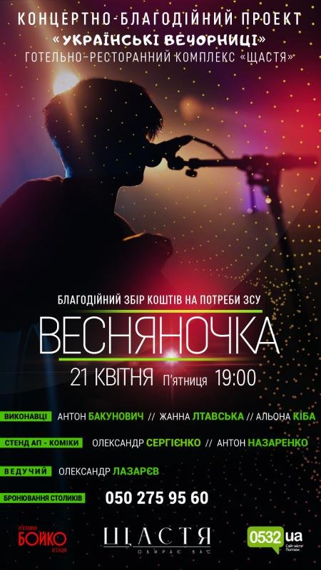 Рекламна агенція БОЙКО запрошує на концертно-благодійний проект «Українські вечорниці»! ??? Збираємо кошти на потреби наших полтавських хлопців з розвідроти 116 Окремої Бригади Тероборони, вч 7044. Не пропустіть «Весняночку» 21 квітня о 19:00 в новому ресторанно-готельному комплексі «Щастя». ? На вас чекає програма з виступами фіналіста «Голосу країни» Антона Бакуновича, віртуозної скрипальки Альони Кіби, співачки Жанни Лтавської з шоу-балетом «Flash», стенд-ап коміків Олександра Сергієнко та Антона Назаренко, а також багато іншого! ? Під час заходу вас також чекають інтерактивні ігри, конкурси з подарунками від партнерів проекту, арт-шоу від «Мистецького штабу» та благодійний аукціон на потреби ЗСУ. ? У залі працюватиме фотограф і мім-шоу, а ведучим програми буде Олександр Лазарєв. ? Партнерами проекту є ТМ SCANDAL і VITAL ICE, мовна школа Speak It, офтальмологічний центр ІРІС, ТМ Pichkar та магазини модного одягу Джинс Хіт. ? Не забудьте забронювати столики за телефоном 0502759560 в Рекламній Агенції «БОЙКО». Вартість вхідного квитка - 400 грн. Бажано попереднє замовлення страв та напоїв. ??️ Не пропустіть цей неймовірний захід та приєднуйтесь до нас на «Весняночці». ??Дякуємо ЗСУ та віримо в Перемогу!! ???