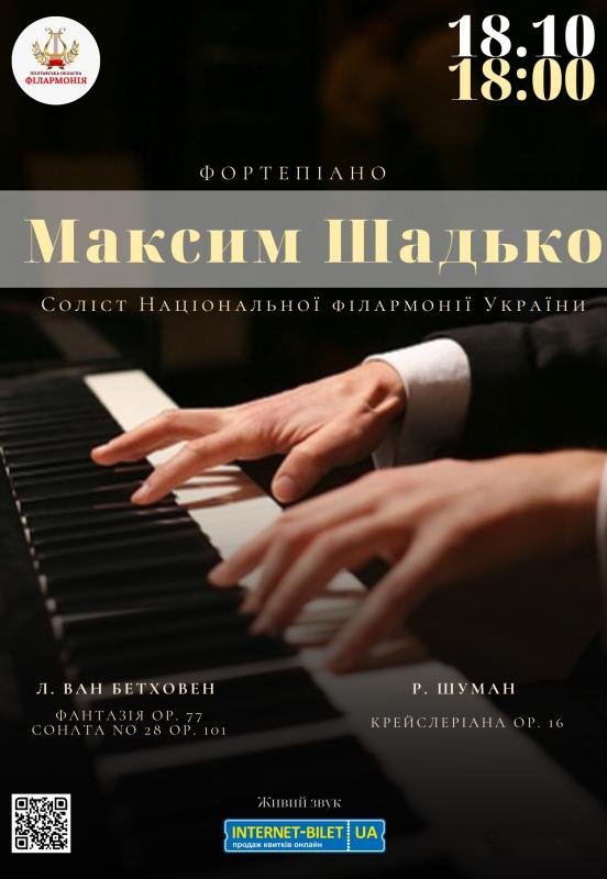 Запрошуємо 18 жовтня на концерт лауреата міжнародних конкурсів соліста Національної філармонії України Максима Шадько (фортепіано, Київ - Харків)