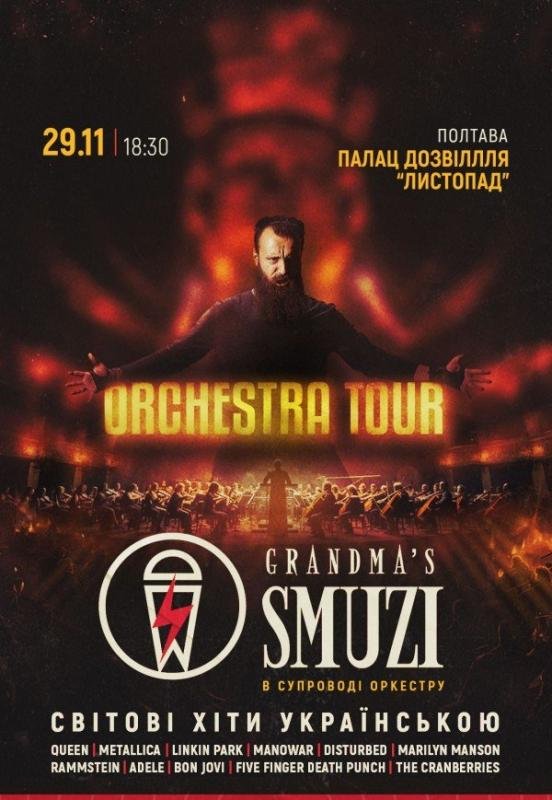 19 листопада 2023 Grandma’s Smuzi вирушають у великий Orchestra Tour, що стане квінтесенцією досвіду та подарує всім глядачам палітру незабутніх емоцій. Тур з оркестром – це абсолютно інший формат, що дасть початок новому етапу в творчості гурту та здивує вас новими аранжуваннями давно відомих композицій. Таке пропустити точно не можна.