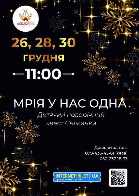 У філармонії Новорічний квест СНІЖИНКИ "МРІЯ У НАС ОДНА" (26, 28, 30 грудня 2023 року, 2,3,6 січня 2024 року, початок о 11 годині.Полтавськаобласна філармонія за адресою:м.Полтава,вул.Гоголя,10-А,вартість квитка 70 грн.).