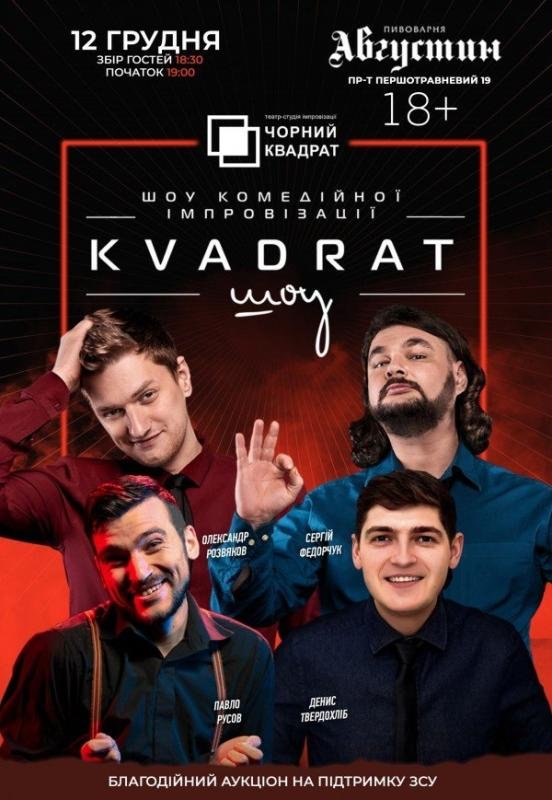 - Театр імпровізації "Чорний Квадрат" – найпопулярніший та аншлаговий театр України. Будь-яке шоу за участю акторів "Чорного Квадрату" – це гарантія гарного настрою.