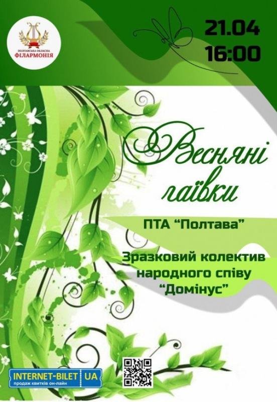 Запрошуємо на захоплюючий концерт "Весняні гаївки"! Назва розповідає, що саме вас чекає! Вперше на сцені філармонії весну закликатимуть діти зразкового колективу народного співу "Домінус" (керівник Аліна Зінченко).