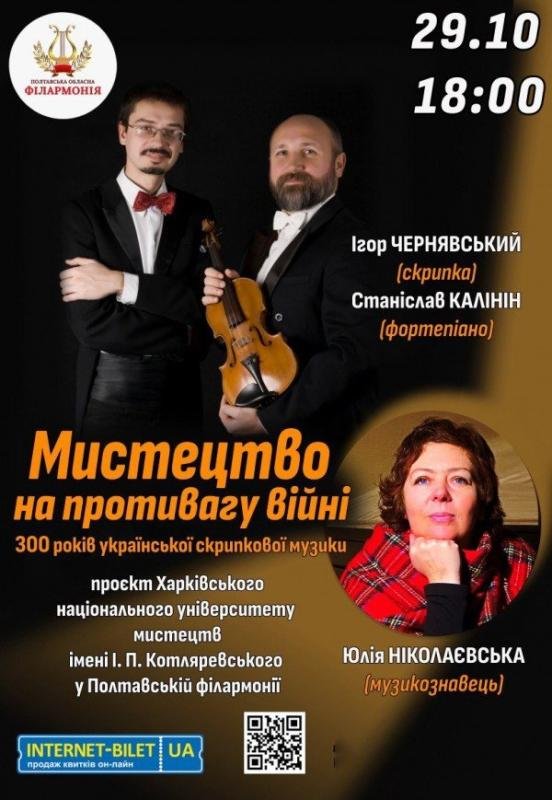 Запрошуємо 29 жовтня на концерт "300 років української скрипкової музики" в рамках спільного проєкту "Мистецтво на противагу війні" Харківського національного університету мистецтв ім. І.П.Котляревського та Полтавської обласної філармонії.
