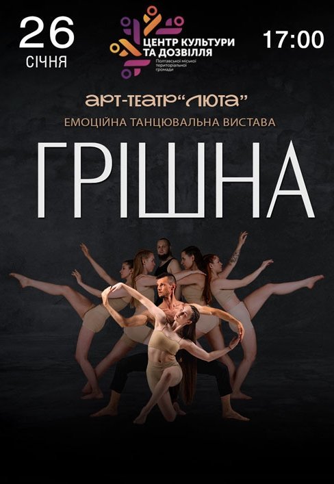 Танцювальна вистава "Грішна" від Арт-Театру "Люта" - це стильна, сучасна і приголомшливо відверта вистава про помилки та каяття, про торги із власною совістю, боротьбу з людським осудом та тонку межу між безчестям та власним щастям. Про грішну любов і одвічне питання "чи насправді краще двоє щасливих ніж троє нещасних?".