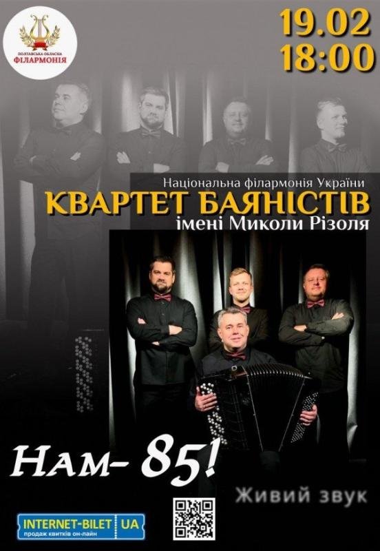 Для вас з новою програмою "Нам 85" виступить квартет баяністів імені Миколи Різоля у складі: