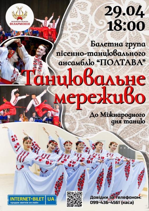29 квітня о 18:00, у Міжнародний день танцю, балетна група уславленого колективу з майже 100-літньою історією – пісенно-танцювального ансамблю «Полтава» – презентує програму «Танцювальне мереживо», у якій відтворить неповторні хореографічні візерунки.