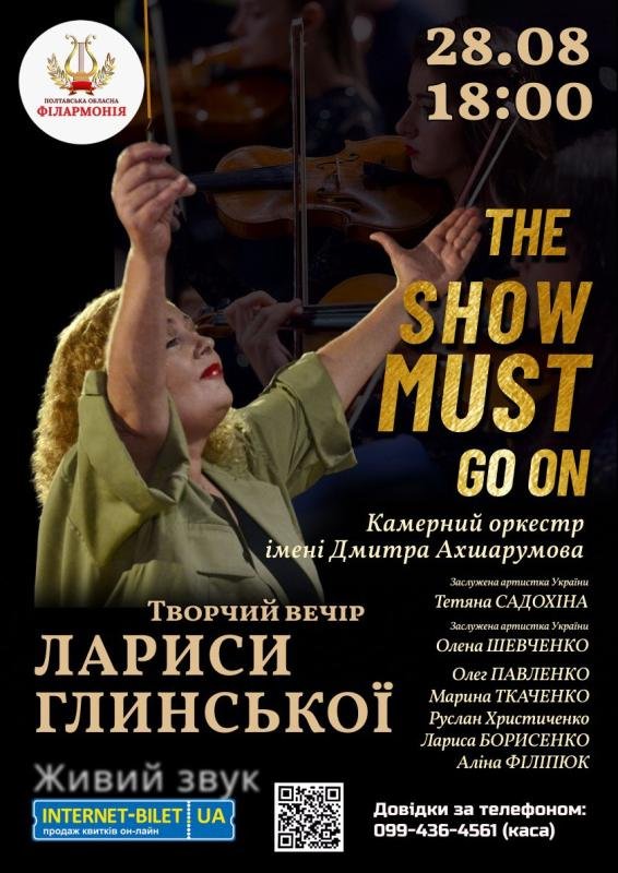 Запрошуємо вас 28 серпня о 18:00 на творчий вечір композиторки й аранжувальниці Лариси Глинської за участю камерного оркестру «КОDА» імені Д. Ахшарумова (художня керівниця – Лідія Шкаровська) та солістів філармонії – заслуженої артистки України Тетяни Садохіної, заслуженої артистки України Олени Шевченко, Аліни Філіпюк, Марини Ткаченко, Лариси Борисенко, Руслана Христиченка та Олега Павленка.
