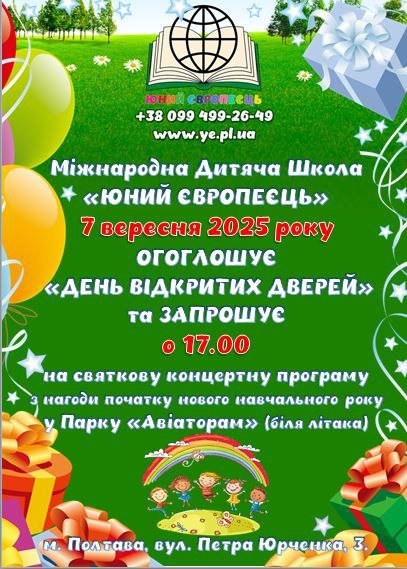 Міжнародна Дитяча Школа "Юний європеєць" 7 вересня 2025 року оголошує "День відкритих дверей" та запрошує о 17:00 на святкову концертну програму з нагоди початку нового навчального року у Парку "Авіаторам" (біля літака).