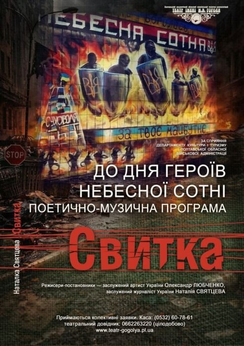 Концертно-поетична програма на основі книги заслуженої журналістки України, кавалера ордена «За заслуги» lll ступеня, лауреатки обласних літературних премій імені І. Котляревського та П. Мирного, професійних конкурсів та фестивалів на всеукраїнському та європейському рівнях Наталії Святцевої "Свитка".