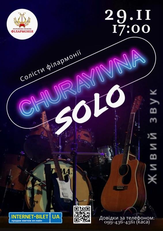 Соло інструментів та голосів, соло емоцій і почуттів вам даруватимуть музиканти ансамблю «Чураївна», а також наші солісти: лауреати всеукраїнських та міжнародних конкурсів Наталія Шинкаренко, Руслан Христиченко, Анастасія Радченко, заслужена артистка України Олена Шевченко, заслужена артистка України Тетяна Садохіна.