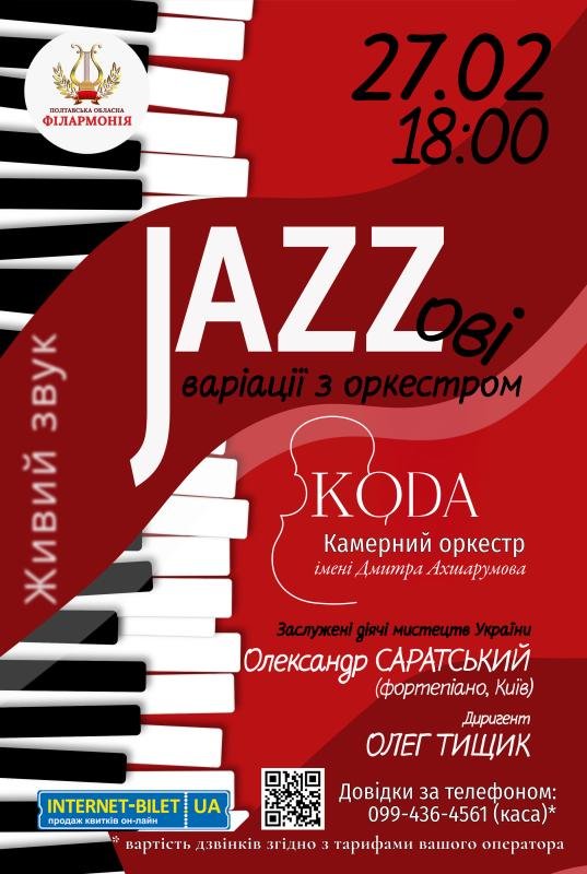Запрошуємо вас 27 лютого о 18 год на концертну програму «JAZZові варіації з оркестром».