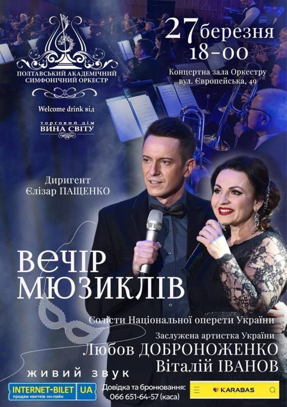 27 березня Полтавський академічний симфонічний оркестр запрошує на неперевершений, яскравий, наповнений чудовою, всім знаною музикою концерт "Вечір мюзиклів". Наші гості - солісти Національної оперети України: заслужена артистка України Любов Доброноженко, Віталій Іванов.