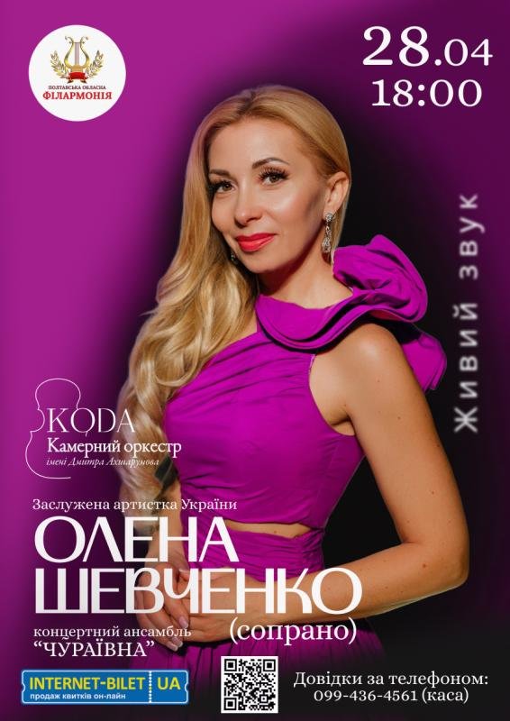 Майстриня академічного вокалу, лірико-колоратурне сопрано, заслужена артистка України Олена Шевченко присвячує концерт красі й тріумфу життя та прагне разом із вами наповнитися кришталевою енергією великої музики.