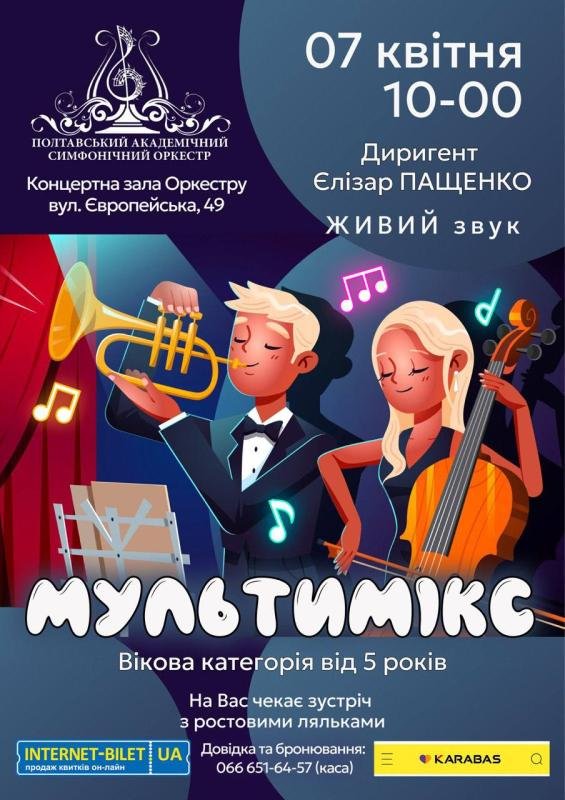 7 квітня. 10-00. Концерт Полтавського академічного симфонічного оркестру для дитячої аудиторії "Мультимікс". НЕймовірна подорож у світ відомих, улюблених дитячих персонажів разом з Оркестром. Також, на Вас чекає зустріч з ростовими ляльками. Диригент - Єлізар Пащенко. Ведуча - Аліна Синяговська. Приймаються колективні замовлення. Вартість квитка - 150 грн.