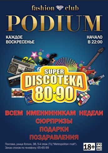 Дискотека 80-90х – это танцы под любимые хиты монстров советской и зарубежной эстрады на все времена: Элвис Пресли, Оттаван, Томас Андерс, C.C. Catch, Baccara, Bananarama, ABBA, Boney M, Sandra, Тото Кутуньо, Руки Вверх, Акула, Вирус, Dемо, Aqua, Ace Of Base, Губин, Prodigy, Scooter, Captain Jack, Иванушки, Haddaway, Real2Real, 2Unlimited, Мальчишник, Краски, Леприконсы, Света, Буланова, Hi-Fi, Dr.Alban, Eiffel 65, Шура, ATB, Блестящие, Михей, Roxette, Ice MC, Сектор Газа, Scatman John, Маша и Медведи, Tom Jones, Bon Jovi, Zdob Si Zdob, E-rotic, Сплин, Spice Girls, BritneySpears, E-type, Гости из будущего, Стрелки, Pharao, Fat Boys Slim, Отпетые Мошенники, Dj Bobo, Modjo, East-17, Bomfunk MC's, Многоточие, Пропаганда, Sash, Мираж, На-на, La Bouche, Mr. President, Газманов, Комбинация, Los Del Rio, Кар-мэн, Ricky Martin, Lou Bega, Русский размер, Лада Дэнс, Masterboy, U-96, Технология, M.C. Hammer, Snap, Комиссар, The Prince Of Rap, Madonna, Фактор 2, Аллегрова, Успенская, 140 ударов в минуту, Профессор Лебединский, Радиотранс, Ласковый май, Ван мо, МГК, 2 brothers of the 4th floor, Eros Ramazzotti, Dido, All Saints, Белый Орел, Metallica, Aerosmith, Sting, Апина, Натали, Насыров, Айвазов, Агутин, Пресняков Мл, Быков, Белоусов, Ляпис Трубецкой, DDT, Chris de Burgh, Savage Garden, No Doubt, No Mercy, Army of Lovers, Heath hunter, Маликов, Жуки, Кай Метов, Хлебникова, Отпетые Мошенники, Богдан Титомир, Никита, Иван Купала, Дискотека Авария, Танцы Минус, Мумий Тролль, Мечтать, Алсу, Игорёк, Ахи-Вздохи, Шао Бао... и многие другие