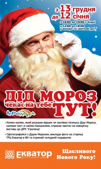 Сфотографуйся з Дідом Морозом,  виклади фото на сторінці ТРЦ "Екватор" в ВК та отримай солодкий подарунок.