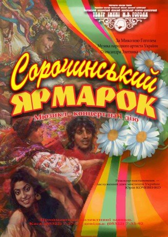 «Сорочинський ярмарок» — це втілення гоголівського сюжету з безсмертними героями у сучасному мюзиклі-концерті, що вперше побачив світло рампи саме у Полтавському театрі. Символічно, що цей мюзикл розпочинає своє сценічне життя на батьківщині великого Гоголя. Яскравий колорит народного дійства, різнохарактерні персонажі, які неочікувано з’являються перед глядачем, жарти, гоголівська містика і багато іншого у новому «Сорочинському ярмарку».