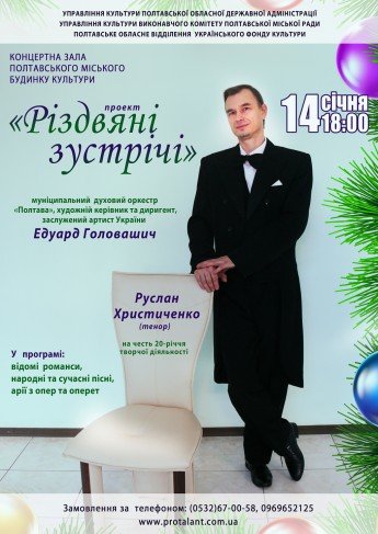 Муніципальний духовий оркестр «Полтава» презентує новий творчий проект «Різдвяні зустрічі». В рамках проекту, щороку, в канун Різдва найкращі співаки, музиканти, творчі колективи Полтави разом з музикантами оркестру створять святкове дійство для поціновувачів високого мистецтва. Розпочинається проект бенефісом співака, педагога і талановитого артиста Руслана Христиченка.