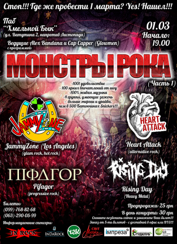 - Heart Attack (Poltava city), альтернативный метал и хиты альтернативный рок и хиты Bon Jovi, Papa Roach, снесет Вам крышу своей энергетикой, а их поющий барабанщик поразит вас прямо в сердце! Осторожно, можете Влюбиться!