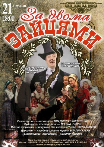 У Полтавському театрі це вже не перше звернення до п’єси «За двома зайцями» - у 1956 році вона була втілена режисером Віталієм Смоляком, а у 1986 році Романом Вальком. Блискуче виконували роль Голохвостого заслужені артисти Андрій Андрейченко та Валерій Івакін, а у роль Проні – Галина Неклич та Катерина Філатова, імена котрих вписані в історію Полтавського театру.