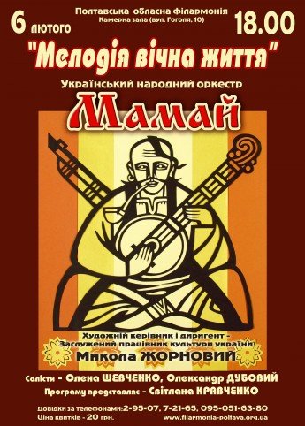 Концерт «Мелодія вічна життя». Всіх слухачів запрошує український народний оркестр «МАМАЙ» та солісти Полтавської обласної філармонії Олена Шевченко (сопрано) та Олександр Дубовий (баритон). Програму представляє Світлана Кравченко.