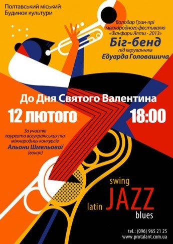 Итак, 12 февраля Вас ждет новая джазовая программа в исполнении Биг-бенда, в составе которого 20 лучших музыкантов МДО «Полтава». Джазовые композиции прозвучат как в стандартном изложении, так и в оригинальных аранжировках и фантазиях.