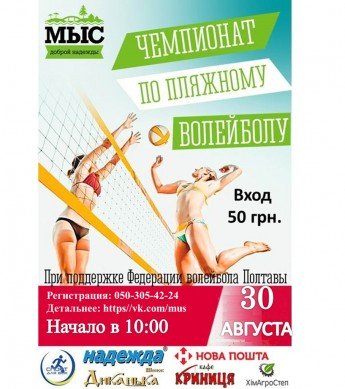 30 августа состоится "Чемпионат по пляжному волейболу", всех приглашаем на базу отдыха "Мыс Доброй Надежды".