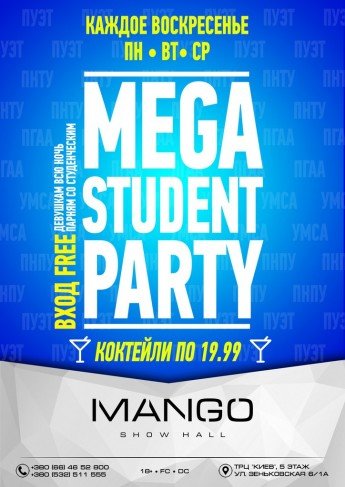 Каждое Вс.Пн.Вт.Ср. SHOW HALL 'MANGO' приглашает всех на тематическую вечеринку "MEGA STUDENT PARTY".