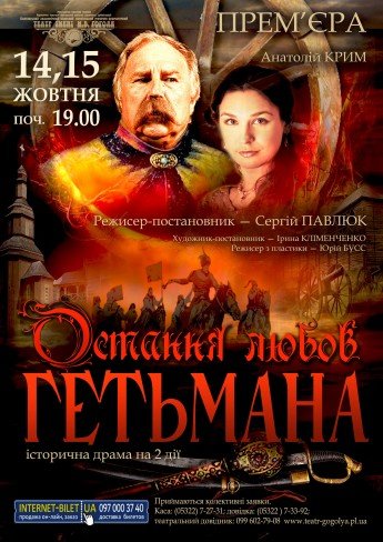 30 жовтня, на сцені Полтавського академічного обласного українського музично-драматичного театру ім. М.В. Гоголя відбудеться прем’єра за п’єсою відомого письменника, заслуженого діяча мистецтв України Анатолія КРИМА “Остання любов гетьмана”.