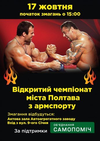 - за результатами відкритого чемпіонату Полтави з армспорту Об'єднання "Самопоміч" проводить змагання у абсолютній ваговій категорії з нагородженням переможців цінними призами.