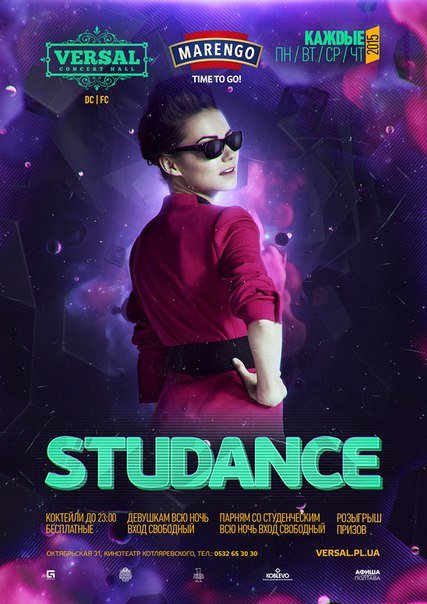 "STUDANCE" - новый сезон самых ярких, эмоциональных и незабываемых студенческих вечеринок. Новыми и самые яркие вечеринки только в "VERSAL". Каждый понедельник, вторник, среду и четверг и воскресенье будут наполнены бурлящим драйвом, мега позитивом, радостью, энергией и невероятными ритмами. Присоединяйся и Ты окунешься в атмосферу незабываемых ощущений!