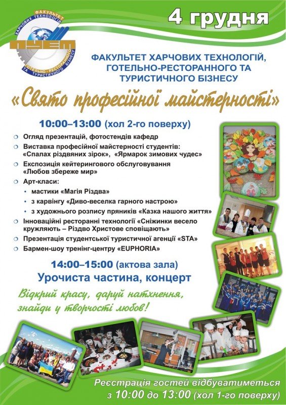 4 грудня у Полтавському університеті економіки та торгівлі відбудеться свято професійної майстерності. Запрошуємо усіх на 14:00, урочиста частина, концерт.