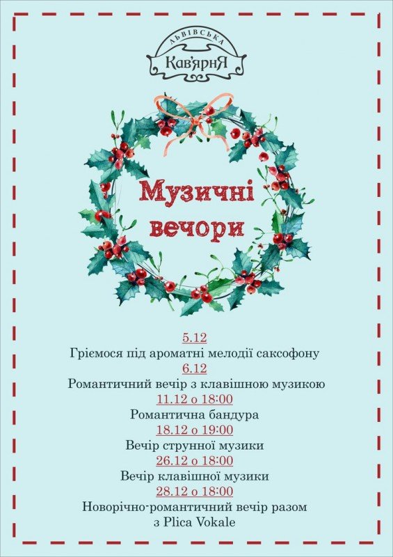 Львівська Кав'ярня запрошує полтавців відвідати темачний вечір з серіїї "Музичні вечори" - Новорічно-романтичний вечір разом з Plica Vokale. Не пропустіть насолодитися музикою разом з Plica Vokale.