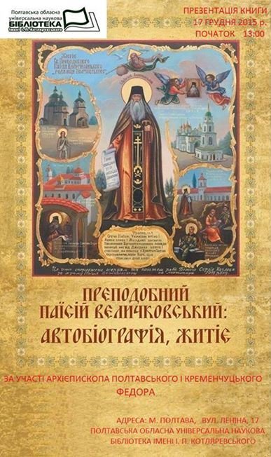 17 грудня о 13-00 год. у літературній вітальні Полтавської обласної універсальної бібліотеки імені І. П. Котляревського відбудеться презентація видання "Преподобний Паїсій Величковський: автобіографія, житіє".  Шановні друзі, запрошую вас!