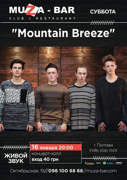 Club & Restaurant «MuZa-BAR» приглашает всех полтавчан на замечательно интересный концерт "Mountain breeze", который состоится 16 января.